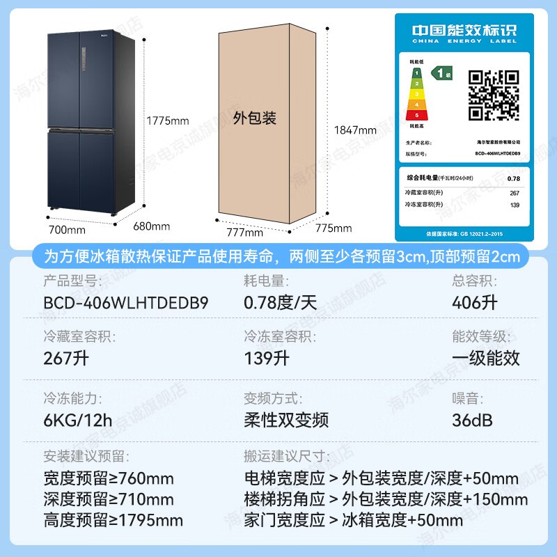 海尔406L风冷十字对开门冰箱BCD-406WLHTDEDB9星石蓝促销