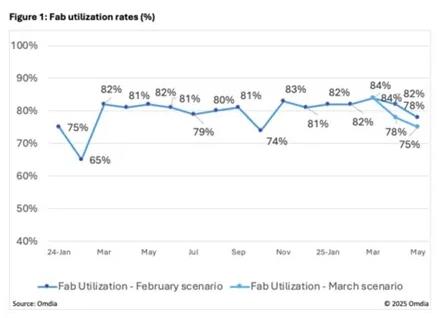 美国针对电视、个人计算机及智能型手机等显示应用产品的新关税政策所带来的不确定性,加上品牌商与代工厂面板订单减少,正促使面板厂商调降产能利用率。Omdia预测利用率将于2025年4月降至80%以下,并在2025年5月进一步下滑至76%。