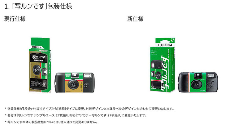 另外,一次性相机「写ルンです」也将更换产品包装,从以前的“袋装”款式改为纸盒装,设计也会进行同步更新,产品名称将由“写ルンです シンプルエース 27枚撮り”变更为“フジカラー写ルンです 27枚撮り”。虽然这次变化不涉及相机的功能和规格,但也不排除一些胶片爱好者会大量购买旧包装进行收藏。