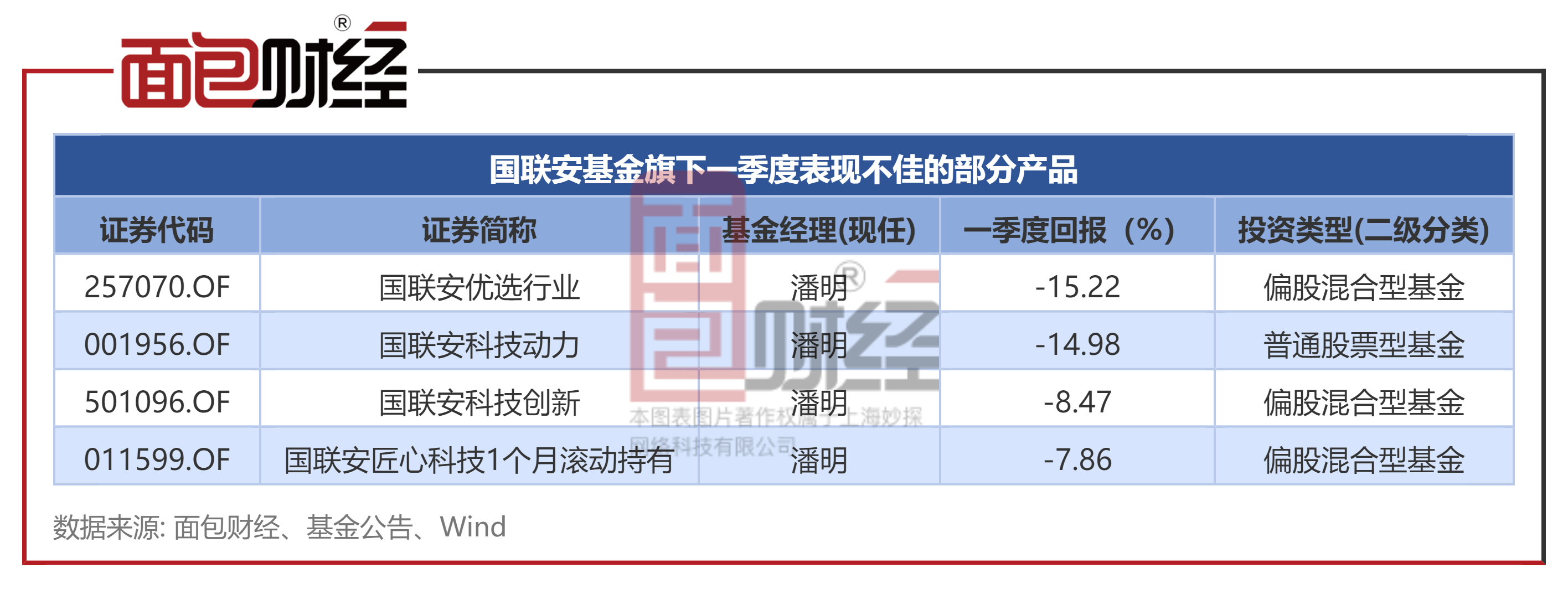 统计显示,除国联安优选行业外,潘明旗下国联安科技动力、国联安科技创新等基金一季度跌幅同样居前。