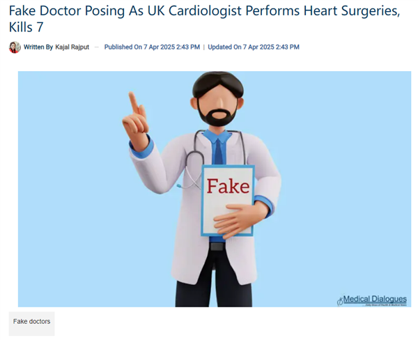 事情发酵后,人们发现这个自称来自伦敦的心脏病专家约翰·凯姆医生,实际上叫纳伦德拉·维克拉玛蒂亚·亚达夫,而他根本不是英国专家。