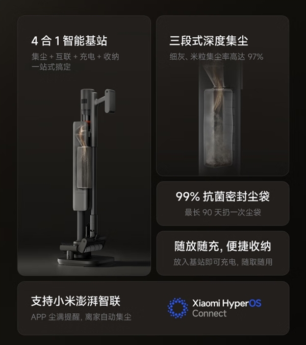 新品最大的亮点就是配备了4合1智能集尘基站,集尘+互联+充电+收纳一站式搞定。