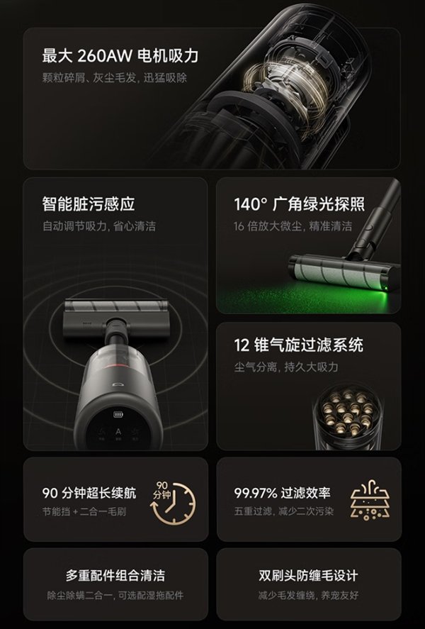搭载260AW米家最强电机吸力,转速高达11万转/分钟,支持三挡吸力调节(节能、智能、强力),用户可根据清洁场景切换。
