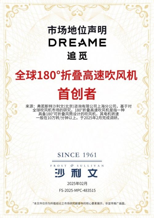 之所以能有如此大幅的业绩增长,其核心还是在于追觅吹风机强大的技术创新能力。前段时间,追觅Pocket系列高速造型吹风机获得了沙利文颁发的“全球180°折叠高速吹风机首创者”认证,以强大技术创新力为消费者提供更优质的吹风、造型体验。