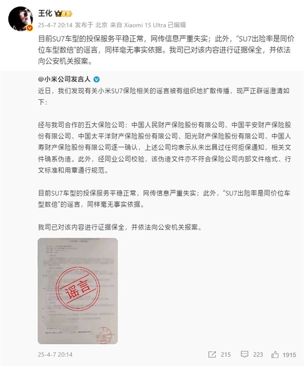 此外,今日晚间,小米公司发言人官方也发文辟谣称,近日,小米SU7保险相关的谣言被有组织地扩散传播。