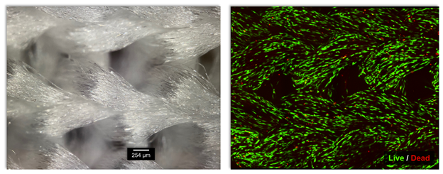 目前,该团队已开展了大量试验。他们将小鼠胚胎成纤维细胞和间充质干细胞嵌入不同的针织结构中,观察在其拉伸时细胞的存活情况。