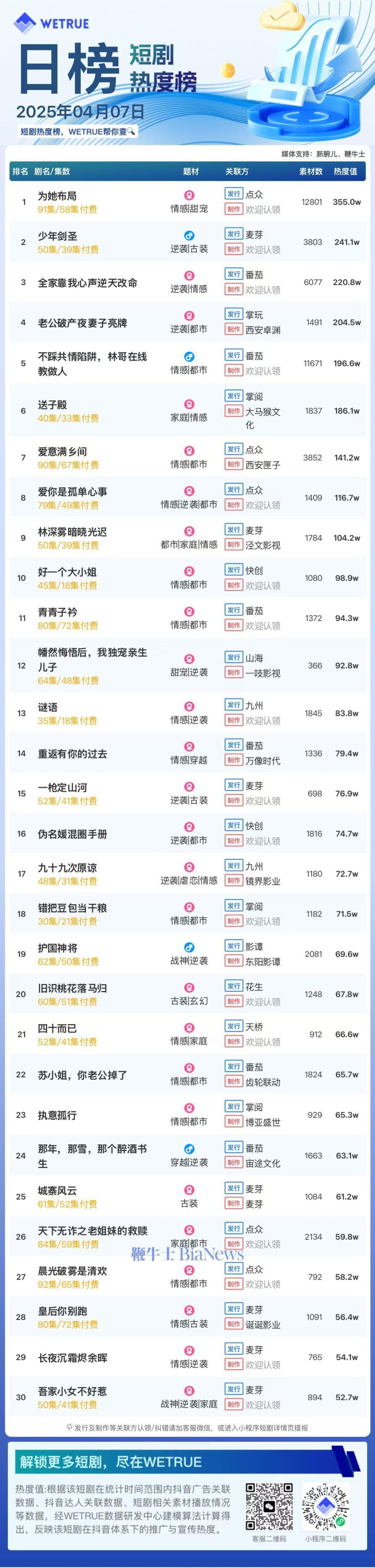 1、本日榜为WETRUE短剧数据公司提供,新腕儿和鞭牛士提供联合支持。