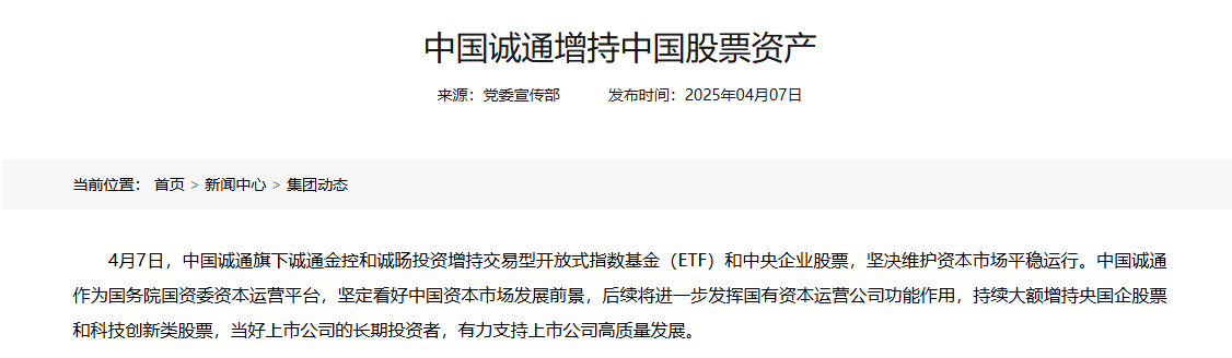财联社4月7日讯,A股市场今日遭遇大幅调整,中央汇金、中国诚通、中国国新纷纷出手增持中国股票资产,坚决维护资本市场平稳运行。