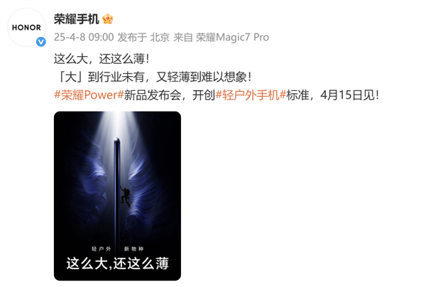 4月8日,荣耀手机官微再发新品预热海报,“这么大,还那么薄”的悬念文案引发热议,“大”与“薄”的组合,暗示荣耀Power可能在超大电池容量与极致轻薄机身的“鱼和熊掌”之间,取得了更好的兼顾与平衡。