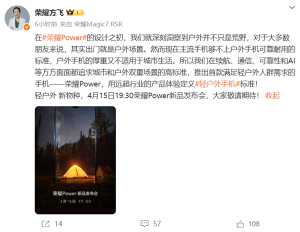 4月15日19:30,荣耀Power将正式揭开面纱。它或许将证明,一部手机真的可以既融入都市生活的时尚轻盈,又承载山川湖海的自由灵魂。这场关于“轻户外新物种”的探索,或许正是未来智能手机进化的方向。