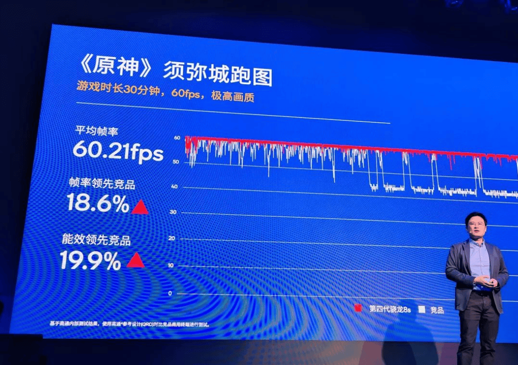 在实测中,第四代骁龙8s中运行《王者荣耀》等竞技类游戏时,几乎可以保持全程的满帧运行(120fps),在平均帧率上比竞品平台领先约6%。而在《原神》等大型开放世界3D游戏中,第四代骁龙8s不仅能够保持长时间的满帧运行,同时帧率还比竞品领先18.6%,并且有着更低的实时功耗。
