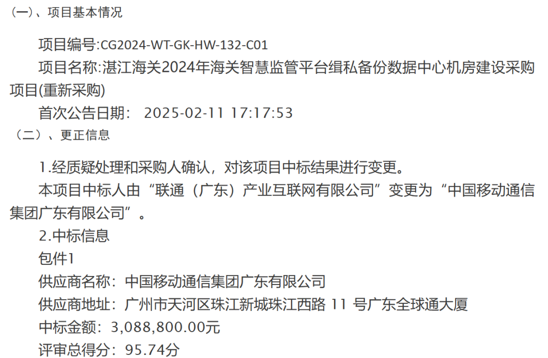 变更公告显示,本项目的中标人由“联通(广东)产业互联网有限公司”变更为“中国移动通信集团广东有限公司”。