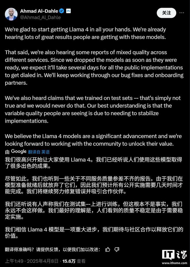 Meta 公司生成式人工智能副总裁艾哈迈德・阿尔・达赫勒(Ahmad Al-Dahle)在社交平台 X 上发表声明称,这种说法“根本不属实”。