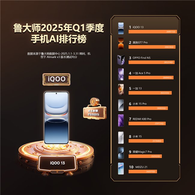 去年鲁大师牛角尖中斩获年度AI性能最强手机的iQOO 13,在Q1季度继续保持了自己的领先位置。