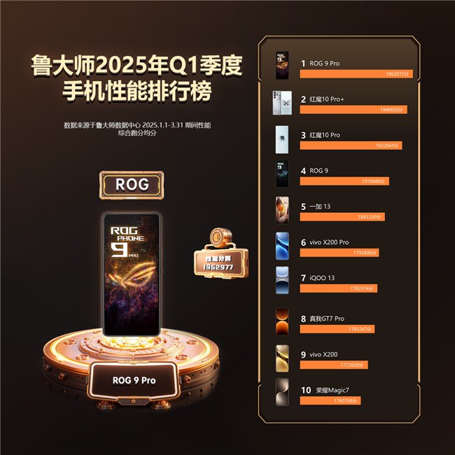 其中ROG 9 Pro依靠1962977性能总分夺得Q1手机性能榜第一。