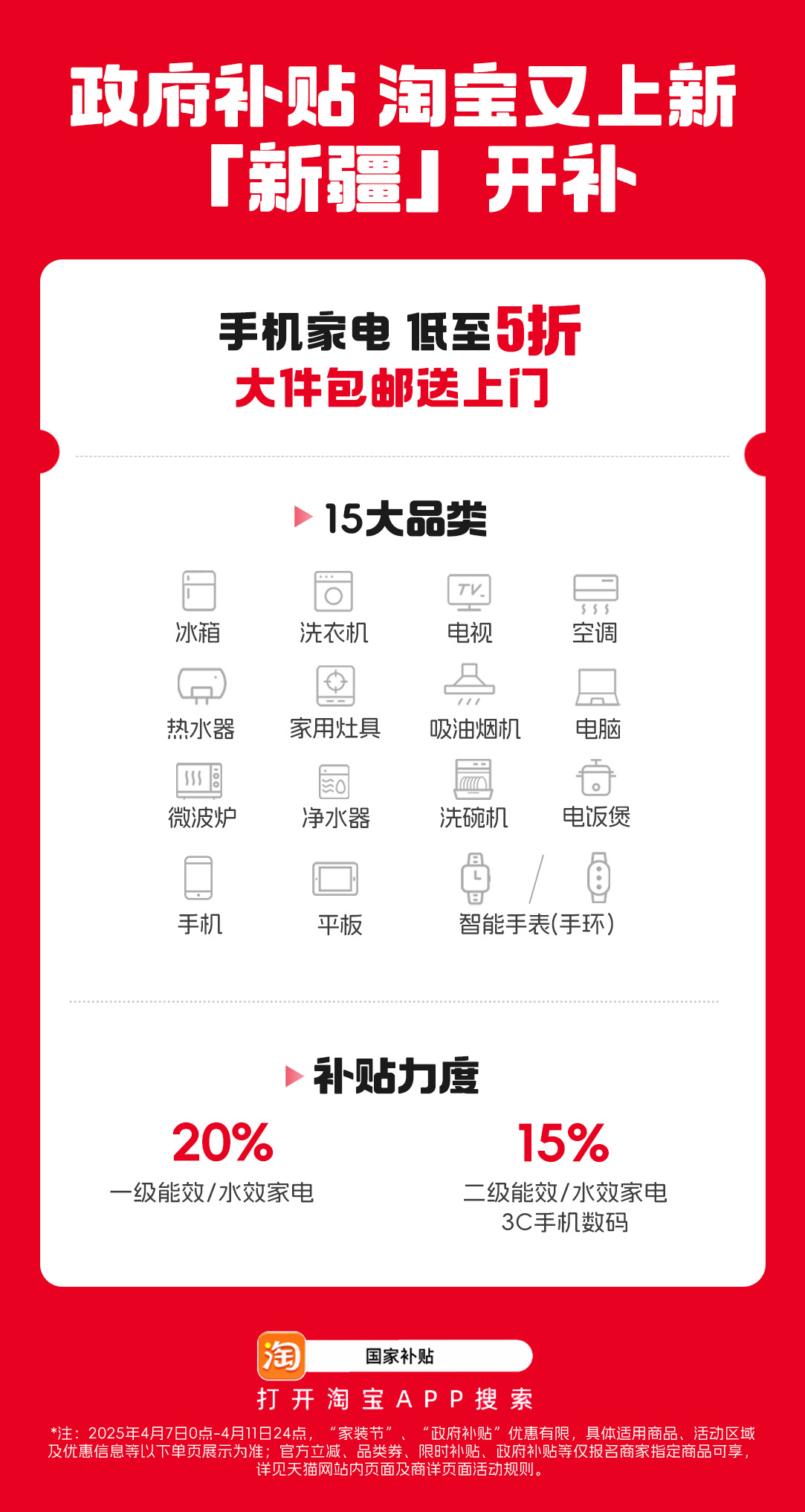 春季家装旺季,政府补贴淘宝又上新!4月8日消息,新疆消费者可以在淘宝领2025年国家补贴了,覆盖15大品类,包含冰箱、洗衣机、电视、空调、热水器、燃气灶、油烟机、微波炉、电饭煲、净水器、洗碗机以及手机、平板、电脑、智能手表手环,每人至高补贴20%。