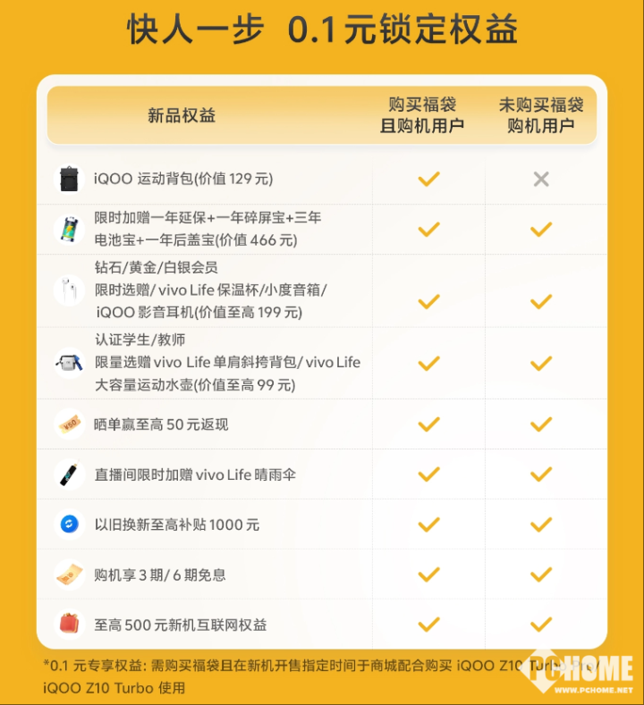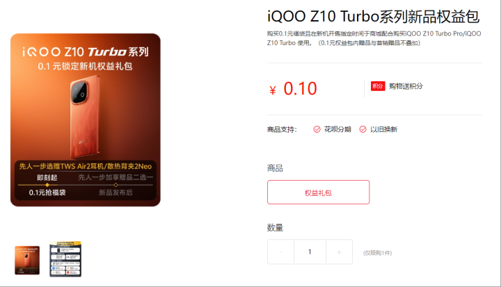 据悉,此次上架的福袋售价0.1元,购买后需要在新机开售指定时间于商城配合购买iQOO Z10 Turbo Pro/iQOO Z10 Turbo使用。需要注意的是0.1元权益包内赠品与首销赠品不叠加。