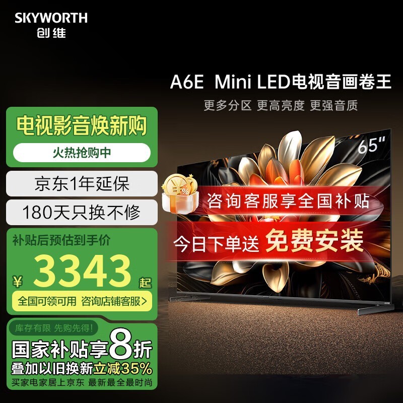 创维65A6E 65英寸电视京东优惠价3343元