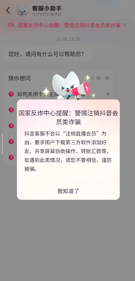 抖音再次提醒,抖音客服不会以任何其他身份给用户发送信息,也不会告知用户“某项功能/服务即将扣费”,不会要求用户下载其他软件或共享屏幕。同时,抖音也在“我的客服”“我的钱包”“直播开播”等多个页面上线反诈提示,希望能提醒用户提高警惕,谨防被骗。