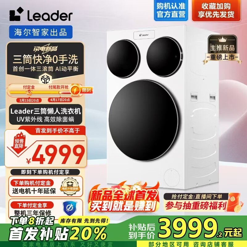 Leader三桶滚筒洗衣机12.5kg智能洗涤仅3999元