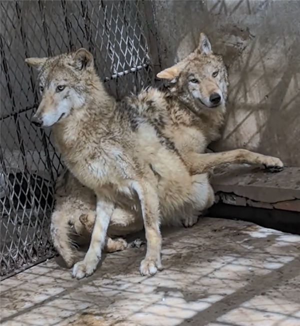 视频里,该饲养员走近狼舍给两匹狼投喂鸡吃,然而好笑的是,两条狼像是看到什么怪物一般,躲在角落里瑟瑟发抖,任凭她如何呼唤也不敢上前。