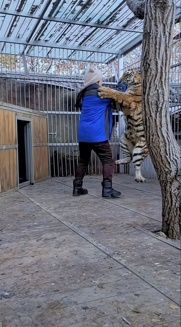 查阅该饲养员往期视频可知,她的日常就是各种和老虎亲密接触,可以说是园内东北虎的“奶妈”,经常和老虎们打成一片,长此以往,身上也就沾染了老虎的气味。