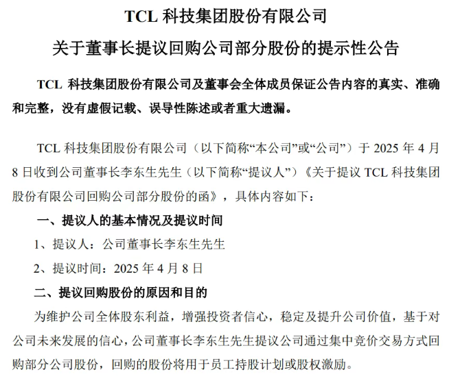TCL科技表示,为维护公司全体股东利益,增强投资者信心,稳定及提升公司价值,基于对 公司未来发展的信心,公司董事长李东生先生提议公司通过集中竞价交易方式回 购部分公司股份,回购的股份将用于员工持股计划或股权激励。