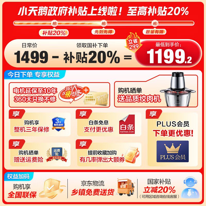 小天鹅TG100V23PRO滚筒洗衣机低至952元