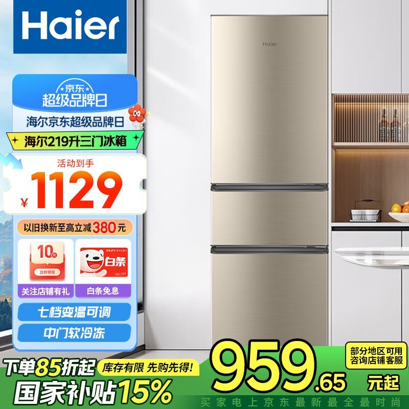 海尔219升三门冰箱 原价1129现959.65