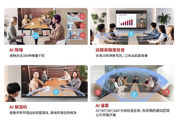 声音体验影响沟通效果。该产品配置先进波束成形16阵列麦克风和高性能AI算法,确保12米内远距离精准拾音,声音大小与清晰度始终稳定。AI降噪可消除300多种噪声,AI音幕屏蔽虚拟音幕外杂音,确保会议专注且安静舒适。AI解混响解决反射声波问题,让语音通透生动。此外,2.1声道天空音箱、50W大功率立体扬声器及AI自适应技术,支持会议与演示场景的智能切换。