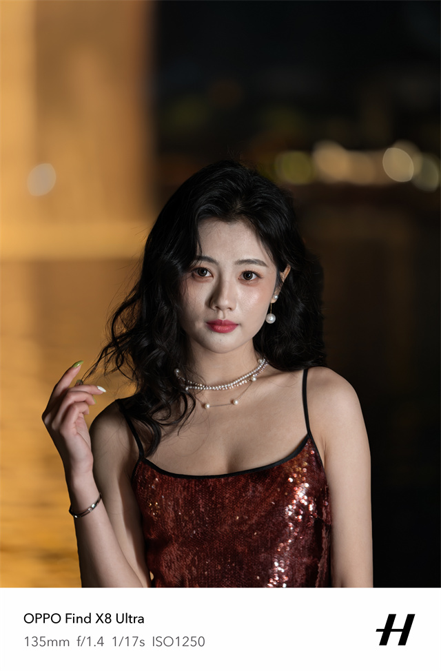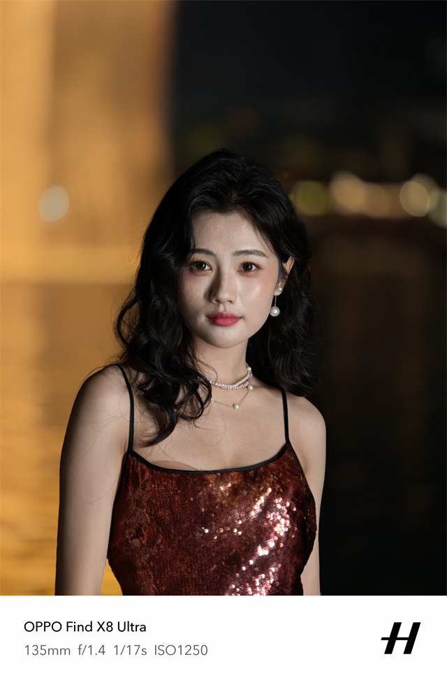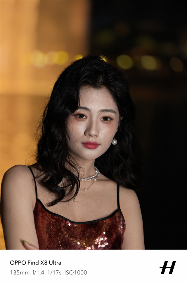 所以在人像拍摄上,OPPO Find X8 Ultra这次十分突出。要说夜景的人像拍摄能力,从样张来看,OPPO Find X8 Ultra的夜景人像拍摄最主要就是对于肤色还原,尤其是复杂光线下,很多手机在这一场景下,都容易出现皮肤偏色的情况,而OPPO Find X8 Ultra得益于丹霞原彩镜头和夜景人像专业镜头的加持下,人像肤色非常自然,没有被环境光线染色,体现出肤色本色,这样拍摄出来的人像更加自然好看。