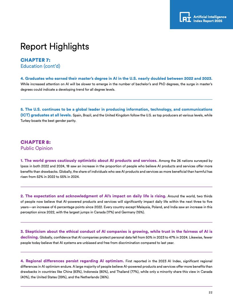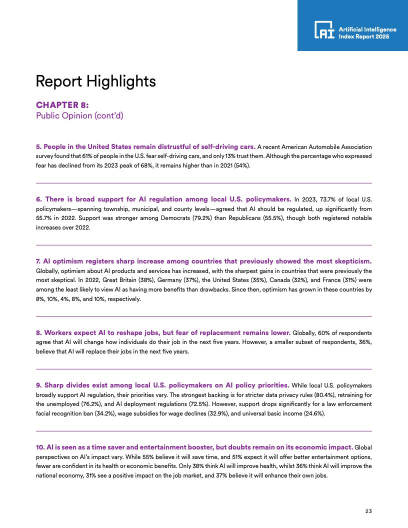 部分国家AI乐观情绪增长:自2022年以来,德国(+10个百分点)、法国(+10个百分点)、加拿大(+8个百分点)、英国(+8个百分点)和美国(+4个百分点)对AI的乐观情绪有所增长。