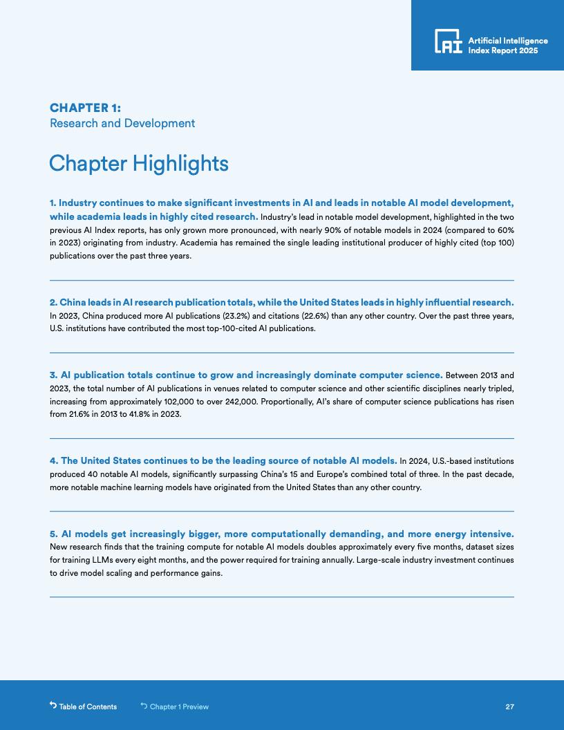 行业在AI模型研发中的主导地位:2024年,近90%的知名AI模型来自工业界,高于2023年的60%。