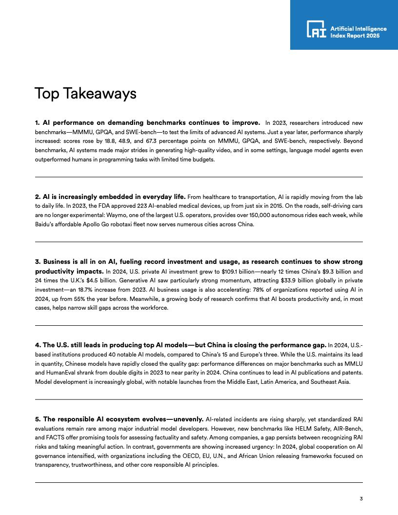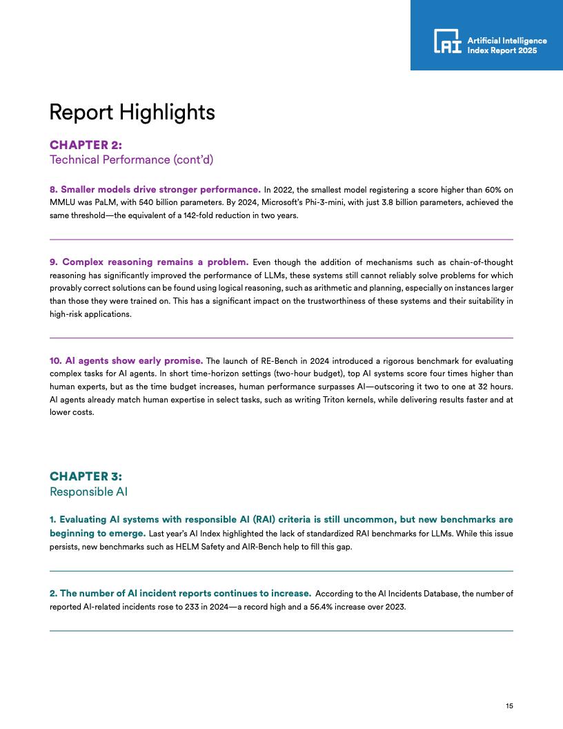 基准测试性能提升:2023年引入MMMU、GPQA和SWE-bench新基准后一年(即2024年),AI模型在这些基准上的得分分别提高了18.8、48.9和67.3个百分点。