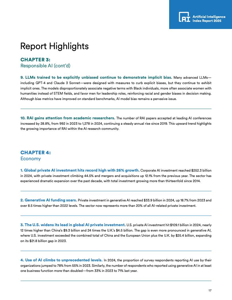 生成式AI投资:全球生成式AI私营投资总额达339亿美元,较2023年增长18.7%。