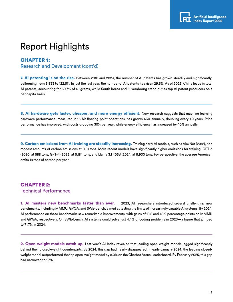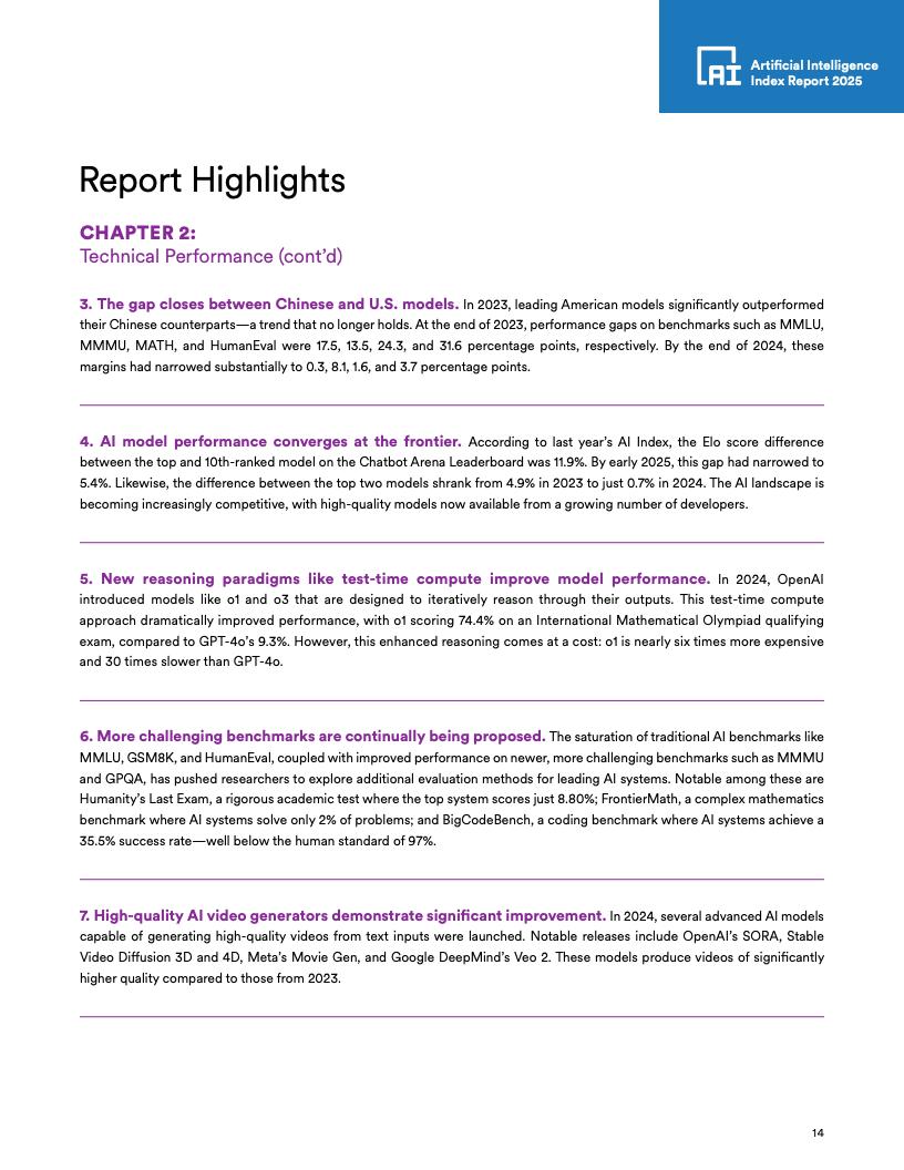 开源与闭源模型性能差距:在某些基准上,开源模型与闭源模型的性能差距在一年内从8个百分点缩小至1.7个百分点。
