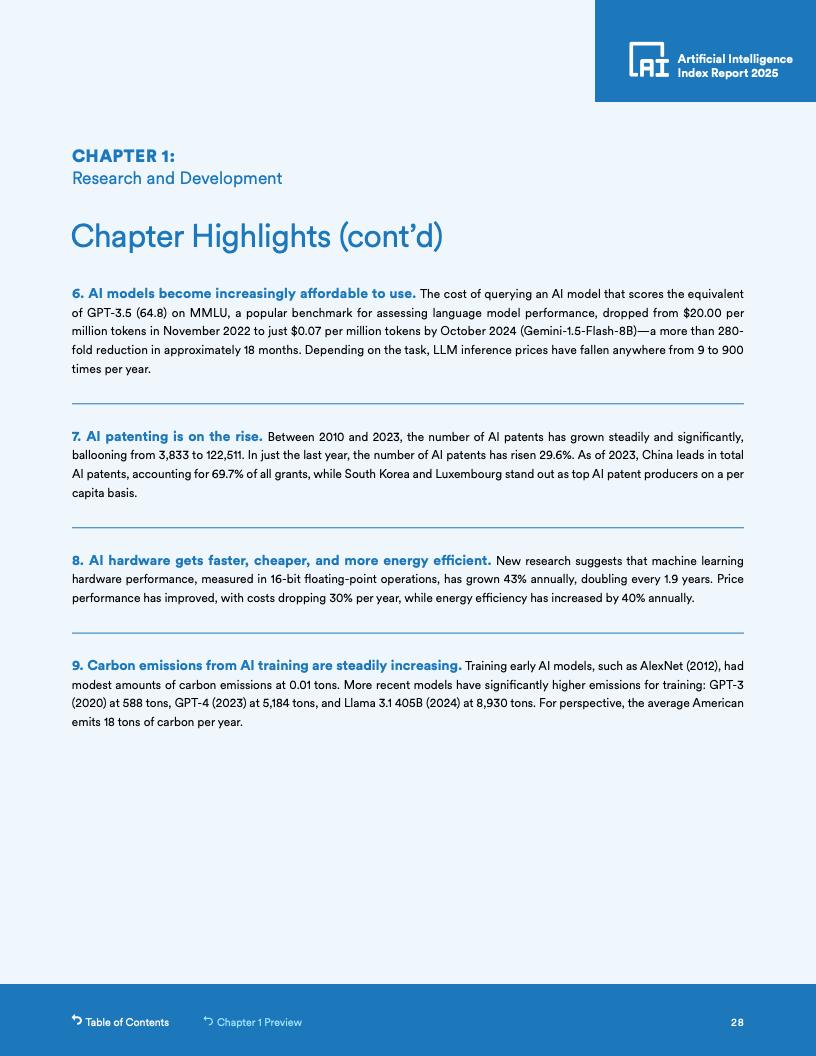 硬件成本与效率:AI硬件成本以每年30%的速度下降,能源效率每年提高40%。