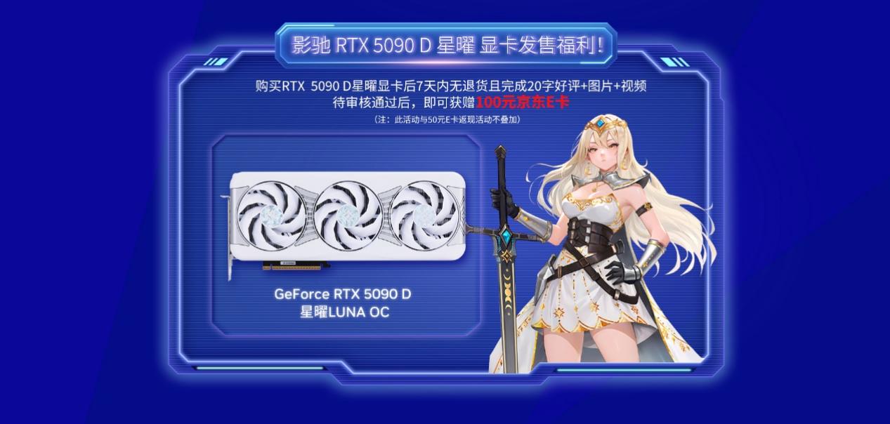 目前,影驰京东自营旗舰店已正式开启晒评获京东E卡活动,只要在7天内购买影驰RTX5090 D星曜LUNAOC显卡无退货且完成20字评论+图片+视频,便可获赠100元京东E卡!