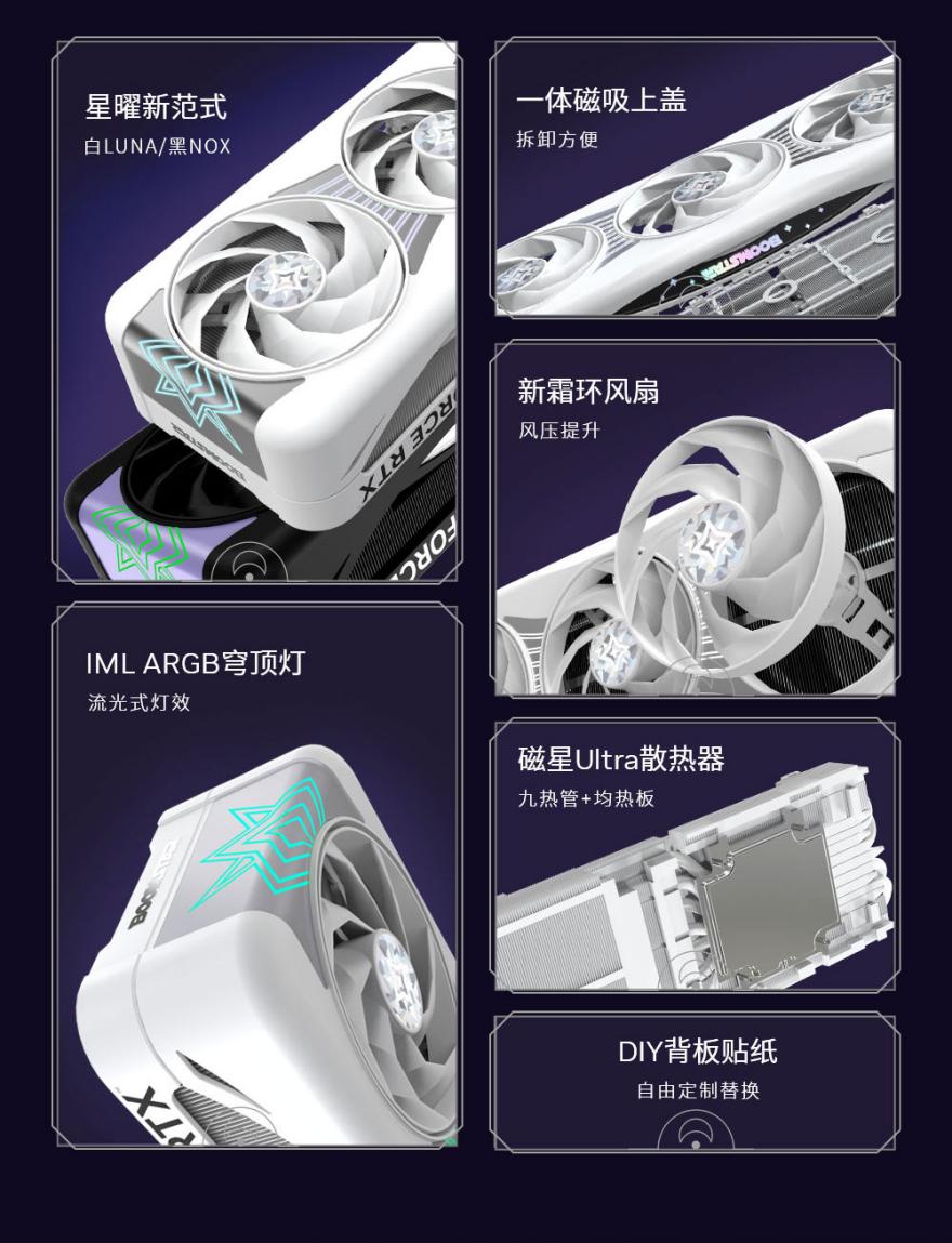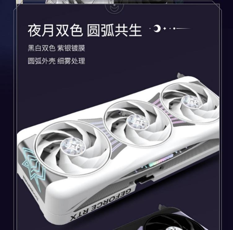 显卡正面配备了采用IML工艺的ARGB穹顶灯,这种工艺为星曜LUNA正面灯组的表面带来了一层硬化的银白色镀膜,可使产品防止表面被刮花和耐摩擦,并可让表面的银色金属质感长久保持。银色镀膜下是多组星轨流光灯,横贯三风扇并于尾端交织形成星环阵列。