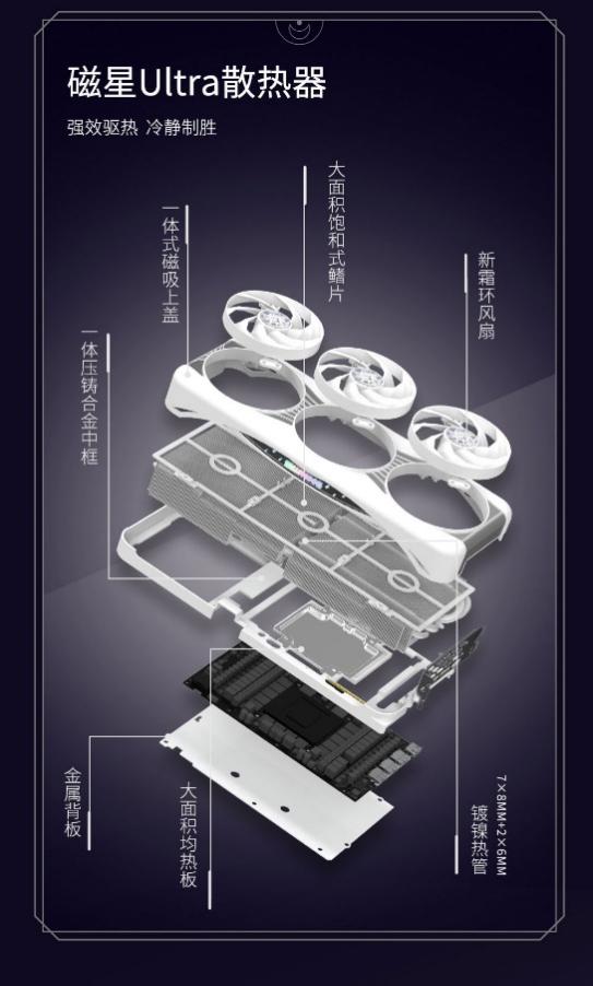 全新的磁星Ultra散热器能够强效驱散RTX5090 D旗舰核心所带来的热量,主要由3把95毫米霜环风扇、大面积鳍片、大面积均热板和九根镀镍热管组成。