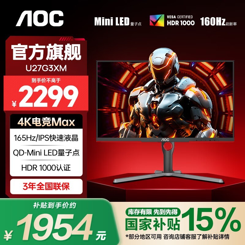 AOC逐光U27G3XM显示器优惠,原价2699现1954