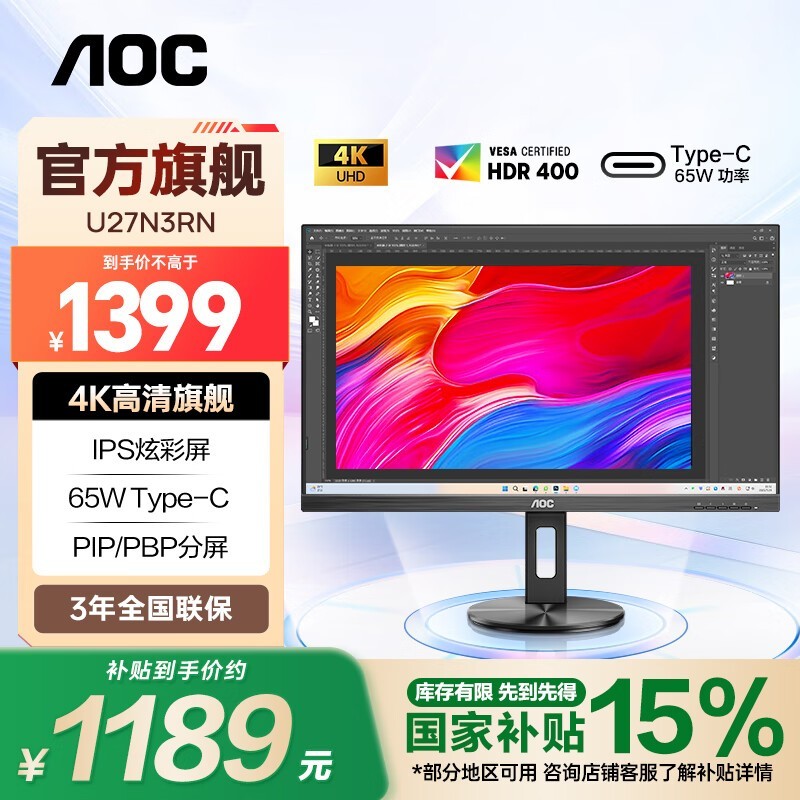 AOC 27英寸4K显示器江浙沪等地区优惠价1189元