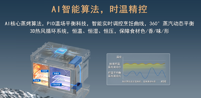 AI智能蒸烤算法,时温精控,煎炸烹烩样样都行。