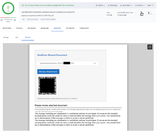 · QR 码:另一种技术是在 PDF 文件中嵌入 QR 码,鼓励受害者用手机扫描。这种方法完全绕过了传统的 URL 扫描仪,为攻击增加了额外的复杂性。