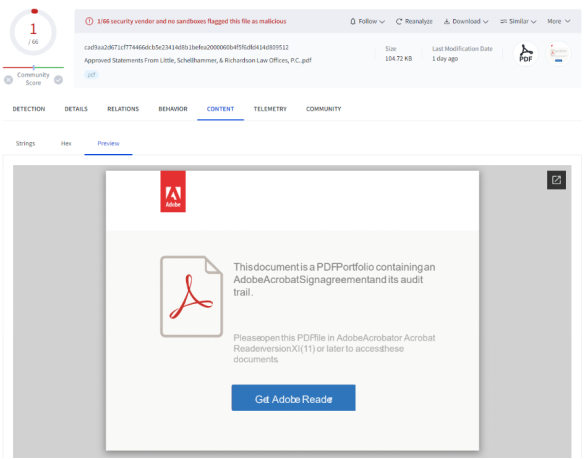 Check Point近期分享了一些攻击实例,其中 PDF 包含一个指向恶意网站或网络钓鱼页面的链接。虽然这种技术的技术含量相对较低,但它的简单性使自动系统更难发现。攻击者的目的是让受害者点击链接,从而启动攻击链。