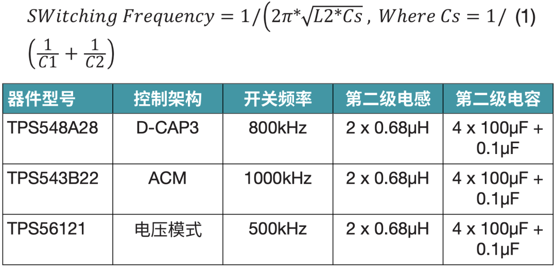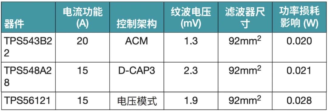 为了约束滤波器设计和性能预期, 允许的纹波电压为输出电压的 ±0.15% 或 ±1.5mV (3mVpp)。 我们采用三个 TI 直流/直流转换器进行比较: 15A D-CAP3™ 降压转换器( TPS548A28 )、 20A 内部补偿高级电流模式 (ACM) 降压转换器 ( TPS543B22 ) 和 15A 电压模式降压换器( TPS56121 )。 我们 在转换器支 持类似第二级滤波器元件的能力范围内, 选择了尽可能彼此接近的输出电压、输出电流和工作频率 。