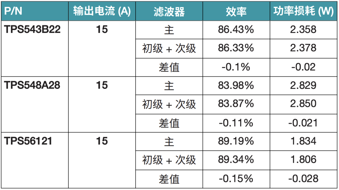 在具有和不具有额外第二级滤波器的情况下测量了每个直流/直流转换器的满载效率以比较功率损耗。 表 2 所示为相关结果。第二级滤波器的功率损耗和效率损失可忽略不计。之所以测量效率和功率损耗差异,是因为 每个直流/直流转换器都具有独特的功率 MOSFE T ,这会 导致效率结论不准确 。效率损失和额外所需的 92mm 2 布板空间是否值得改善输出电压纹波,这由设计人员决定。