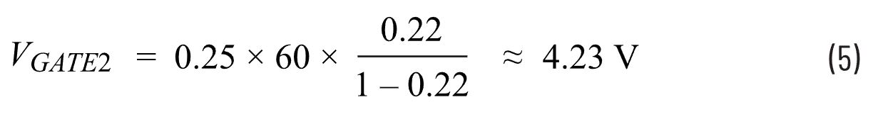p>在设计示例中,栅极2最低电压可依照式5进行计算。当输入直流电压达到最大值时,栅极2上的电压只有4.23 V。