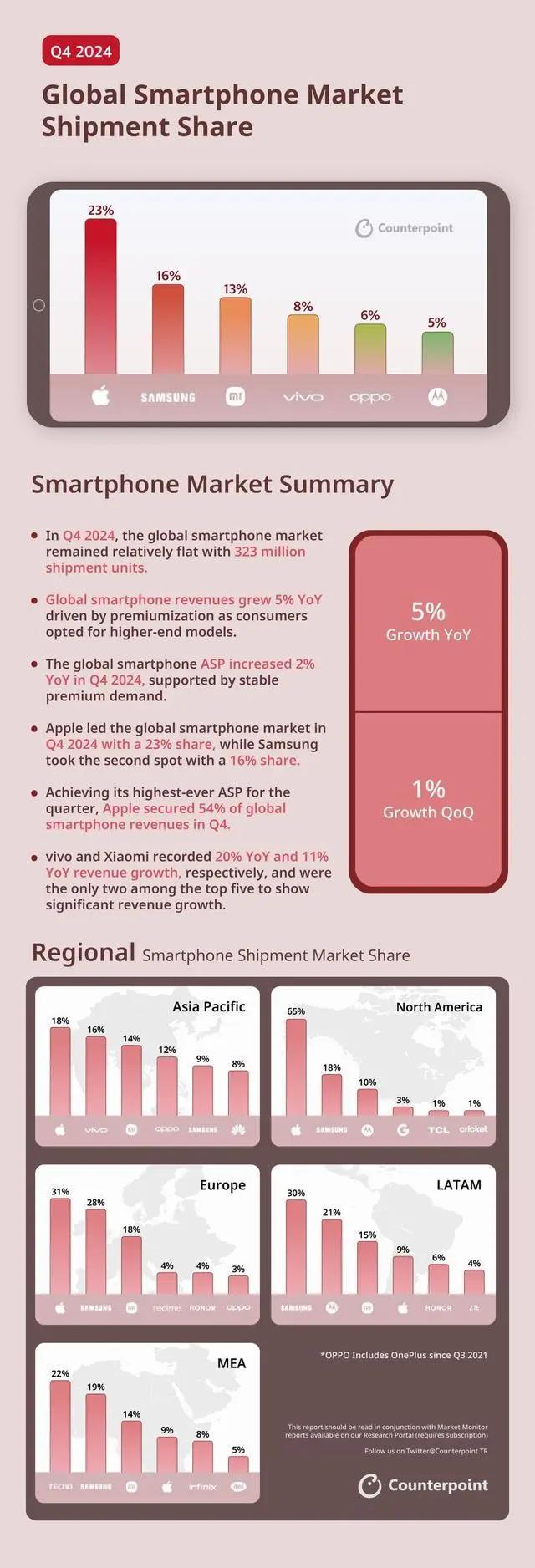 尽管市场需求未见大幅波动,但主要得益于消费者对高端机型的青睐,高端化趋势成为推动收入增长的主要因素。数据显示,全球智能手机收入同比增长 5%,平均售价(ASP)也上涨了 2%。