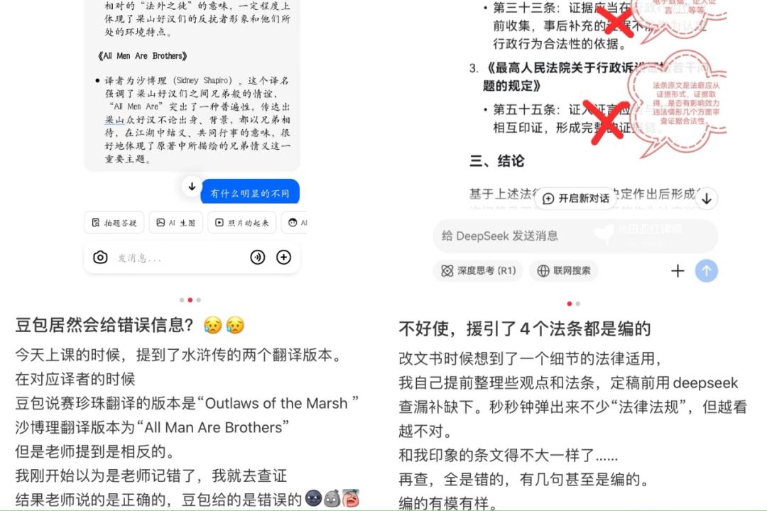 用AI搜集资料、做PPT、改论文……虽然AI暂时还不能“替代”人类,但不可否认的是,AI正以前所未有的速度,渗透进普通人的日常工作和生活中。然而,已经有越来越多人发现,AI或许并不能取代自己的工作,但或许能让自己丢掉工作。漏洞百出的数据、胡编乱造的资料和引用来源、禁不住考究的文史解读……当你以为能靠AI省时省力地完成论文或工作,却有可能反被AI“背刺”。在那些看似充足的数据和论据背后,说不定就藏有诸多错误信息。而更令人担忧的是,当这些信息被二次加工、援引和传播,“后真相时代”将迎来更大的挑战……AI也会一本正经说“瞎话”“年小从他爱梨栗。”当大学生薛云(化名)在准备一份课堂作业的PPT时,因为不确定这句诗里是“纵”还是“从”,便将这句诗输入她常用的AI助手,却发现,AI回复称,这句诗“化用自唐代诗人贯休《书石壁禅居屋壁》中的‘年少而何知,遇物尽虚掷。得稳即自安,年衰需警策’,以儿童贪玩类比年少时易放纵……”薛云很惊讶,因为这句诗实际上出自于王安石的《赠外孙》。“要不是我知道这诗,真的很容易被糊弄过去。”然而,当薛玉很生气地回复AI助手,“你确定?”该AI助手再一次给出了错误的出处,“抱歉,原句出自韦庄的《与小女》……”这打破了薛玉对AI的认知,“如果查不出相关信息给不出答案,还可以理解。怎么还能瞎编?”当薛玉差点被“坑”,在一家自媒体公司上班的雅雅也险些因AI“捅了大娄子”。不久前,为了更新一篇与“造纸史”相关的公众号文章,雅雅需要搜集大量与之相关的资料,为了节省时间,她把需求发给DeepSeek,得到了这样一段信息:“西安博物院藏唐代‘开元户籍册’残片显示,当时已出现80g/㎡的加厚公文纸(文物检测报告)。这种以楮树皮为原料的纸张,历经千年仍保持着0.3秒的墨水渗透速度。” 雅雅将这段话写进文章后,临要发布时再做了一次相关资料核查,却发现,在网上检索不到以上这段信息的内容,“甚至无法确认西安博物院是否藏有这一文物,因为能查到的资料显示,是国家图书馆藏有相关残片。更不用说这段话里涉及的数据,更是无从考证。”雅雅很后怕,如果自己把这段话写进文章,文章又被再度援引,“后果不堪设想。”而这并非孤例。事实上,在小红书、微博等社交平台,有不少人都分享了AI胡编乱造的情况。既有网友发现DeepSeek编造了“郭沫若在甲骨文研究中对‘各’的含义进行考释”,也有网友发现豆包在被问及水浒传不同版本的译者时张冠李戴,还有网友发现DeepSeek连法条也能胡编乱造,“援引的法律法规全是错的,甚至有几句是编的,编得有模有样……”其中,一篇名为“DeepSeek睁眼说瞎话,编造答案被我抓现行”的笔记提到,博主为了测试AI是否诚实,故意问了一组偏门问题,并且明确提示“如果不知道就直接说不知道”,然而,“DeepSeek在回答第一个问题时说不知道,回答第二个问题就开始编造答案。被我指出来并再次强调要不知道就说不知道后,还在继续扯淡。直到我再次戳破其瞎话,并强调我有原书可以随时校验其回答后,才承认自己确实不知道。”在这条笔记下,不少网友提到,“我问了两个工作问题,也是给我无中生有,驴唇不对马嘴”“我让AI推荐小说,它直接给我瞎编,一本都搜不出来”……此外,不仅用AI搞工作和学术不可靠,连日常生活也不一定能信任。此前,B站一位UP 主就录制了一期《用 DeepSeek 推荐买汕头特产,结果翻车了吗?》。视频中,UP 主向 DeepSeek 询问汕头手信店。虽然 DeepSeek 精准地读取了 UP主的思维,按照生鲜、零食、茶叶、非遗手工品的分类进行了细分,显得专业又可靠,但事实上,它所推荐的店面统统不存在。迷信AI,只会害了自己种种案例证明,雅雅的担忧并非空穴来风。在播客《东腔西调》的一期节目中,清华大学社会科学学院社会学系副教授严飞也曾提到,当他让DeepSeek概括简介一本书的内容时,其给出了一些并不准确的内容,“而AI虚构的内容也可能会被反复引用。”而这样的事情,早已发生。3月初,公安部网安局公布调查结果:网民夏某在视频《80后到底还剩多少人》中捏造数据“截至2024年末,80后死亡率突破5.2%,相当于每20个80后中就有1人已经去世”,被予以行政处罚。而据《新周刊》,这段内容经公安机关证实,正是由AI编造。此外,据公开报道,在《黑悟空》游戏上线后不久,来自国内科技网站的一位员工在五小时内接到了20来个 “骚扰电话”。而将其电话公布到网络上的,是微软的BingAI助手。当人们在Bing搜索中输入“黑神话悟空客服”后,这位个人员工的手机号就会出现在搜索结果里。不仅如此,AI有时还“硬加罪名”。据虎嗅,2023年,法学教授乔纳森·特利(Jonathan Turley)收到了一位律师朋友的邮件。朋友告诉他,他的名字出现在ChatGPT列举的“对他人实施性骚扰的法律学者”名单上。ChatGPT还给出了“性骚扰”信息的细节:特利教授在前往阿拉斯加的班级旅行时,曾发表过性暗示言论并试图触摸一名学生。ChatGPT引用了一篇并不存在的《华盛顿邮报》文章作为信息来源。正如《新周刊》所说,这就是所谓的“AI幻觉”——生成式AI是有可能“胡说八道”的,它们会在看似真实的陈述中夹杂错误信息。值得一提的是,近日,在Vectara HHEM人工智能幻觉测试中,2025年1月发布的DeepSeek-R1模型显示出高幻觉率。而当锌刻度向DeepSeek提问“为什么AI会